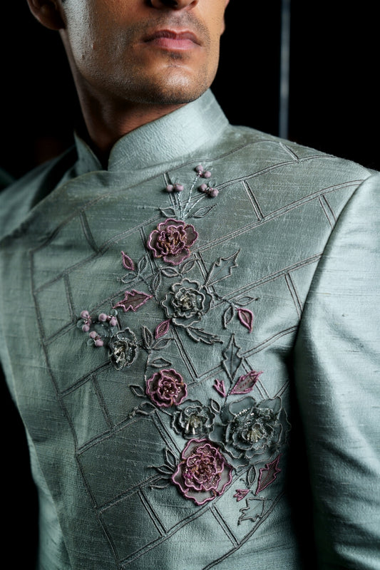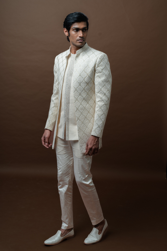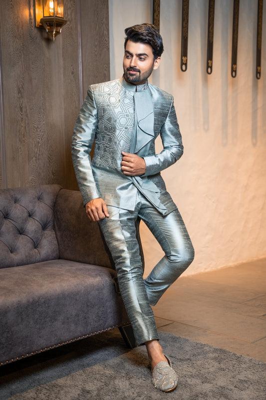 Discover about contemporary and traditional Jodhpuri suits for South Indian grooms. Perfect for sangeet, reception, or pellikoduku events. elegantly tailored with a traditional foundation. Discover royal designs exclusively at Tejas in velvet, silk, and jacquard.
