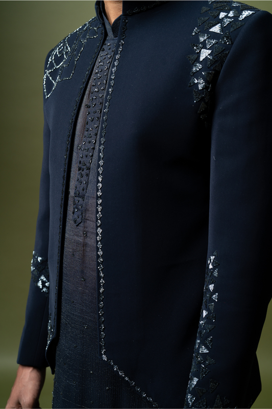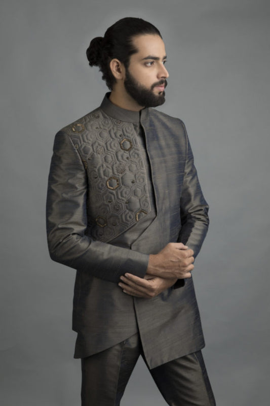 Stone Grey Contemporary Indo-Western with Asymmetrical Hexagon Embroidery