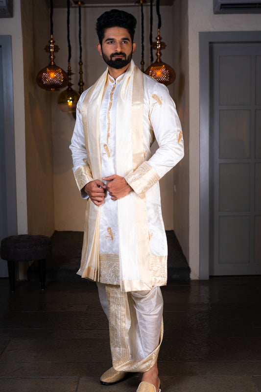 Men's Ivory Embroidered Kurta with Draped Dhoti & Stole