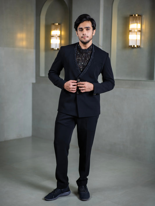 Black Indo-Western Tuxedo with Hand-Embroidered Crystal Detailing